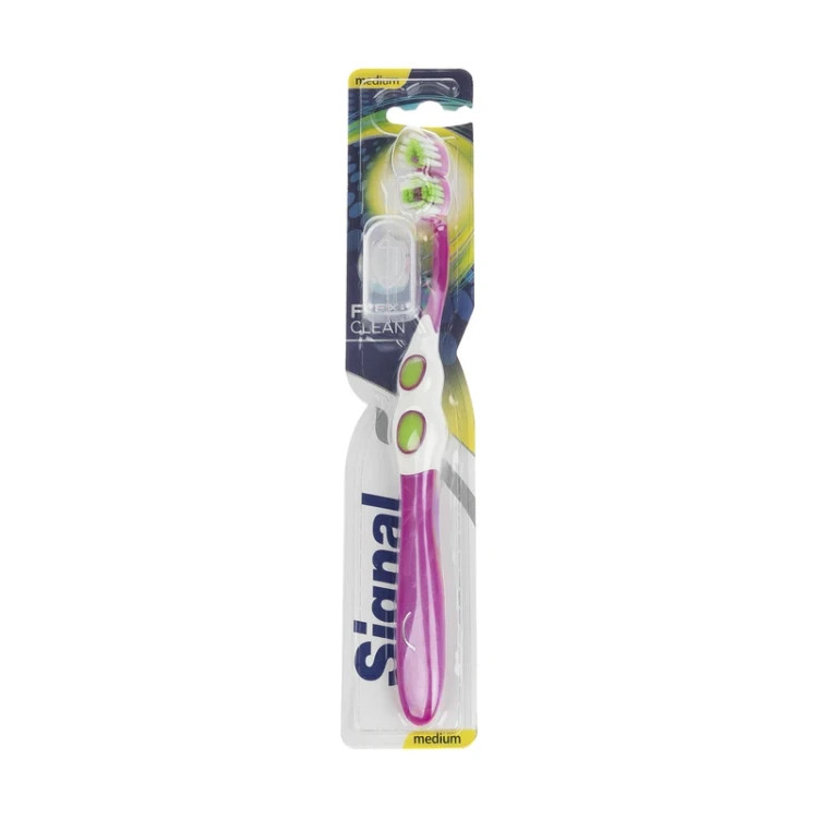 مسواک فلکسی کلین سیگنال برسی با زبری متوسط دارد و از نظر برس از بهترین انواع مسواک محسوب میشود. این مسواک سری انعطاف پذیر دارد که به وسیله آن به راحتی میتوان تمام سطوح دندان را از جرم پاک کرد. دسته این مسواک هم به شکلی درست شده که به سهولت در دست جای میگیرد و بدون زحمت میتوان با آن کار کرد. مسواک Flexy Clean یک درپوش هم دارد که پس از استفاده از مسواک و اتمام کار میتوانید آن را روی محصول قرار دهید. این مسواک ساخت سوئیس بوده و از کیفیت بسیار مطلوبی برخوردار است.